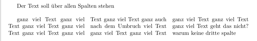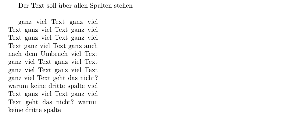 \documentclass{article} \usepackage[ngerman]{babel} \usepackage[latin1]{inputenc} \usepackage[T1]{fontenc} \usepackage{lmodern} \usepackage{multicol} \usepackage{xcolor} \usepackage[a4paper, left=3cm, top=2cm]{geometry} \begin{document} ... \setlength{\columnsep}{48pt} \setlength{\columnseprule}{1pt} \renewcommand{\columnseprulecolor}{\color{green}} \begin{multicols*}{3}[Der Text soll über allen Spalten stehen] ganz viel Text ganz viel Text ganz viel Text ganz viel Text ganz viel Text ganz viel Text ganz viel Text ganz \columnbreak auch nach dem Umbruch viel Text ganz viel Text ganz viel Text ganz viel Text ganz viel Text ganz viel Text geht das nicht? warum keine dritte spalte viel Text ganz viel Text ganz viel Text geht das nicht? warum keine dritte spalte \end{multicols*} ... \end{document}