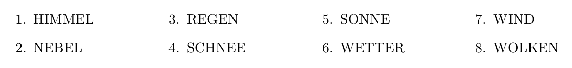 Beispiel Eingabe\begin{multicols}{4} \begin{enumerate} \item HIMMEL \item NEBEL \item REGEN \item SCHNEE \item SONNE \item WETTER \item WIND \item WOLKEN \end{enumerate} \end{multicols}Ausgabe